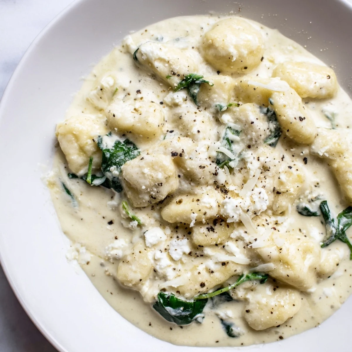 It was a rainy Tuesday evening when I first threw this dish together, standing in my kitchen with a package of gnocchi I'd bought on impulse and a wilting bag of spinach that needed using. The way the creamy sauce clung to those tender pillows felt like a warm hug on a cold night, and I knew immediately this would become my go-to comfort meal. Something about the salty tang of feta cutting through all that richness just works magic.