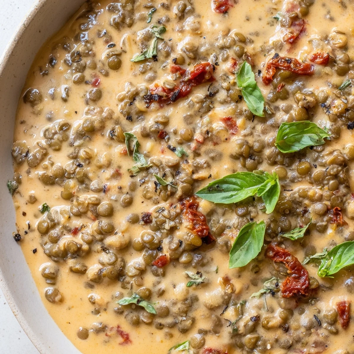 What makes these lentils truly special is the luxurious sauce—sun-dried tomatoes provide concentrated umami while cream adds velvety richness. Fresh basil finishes the dish with bright, herbaceous notes that balance the indulgent base.