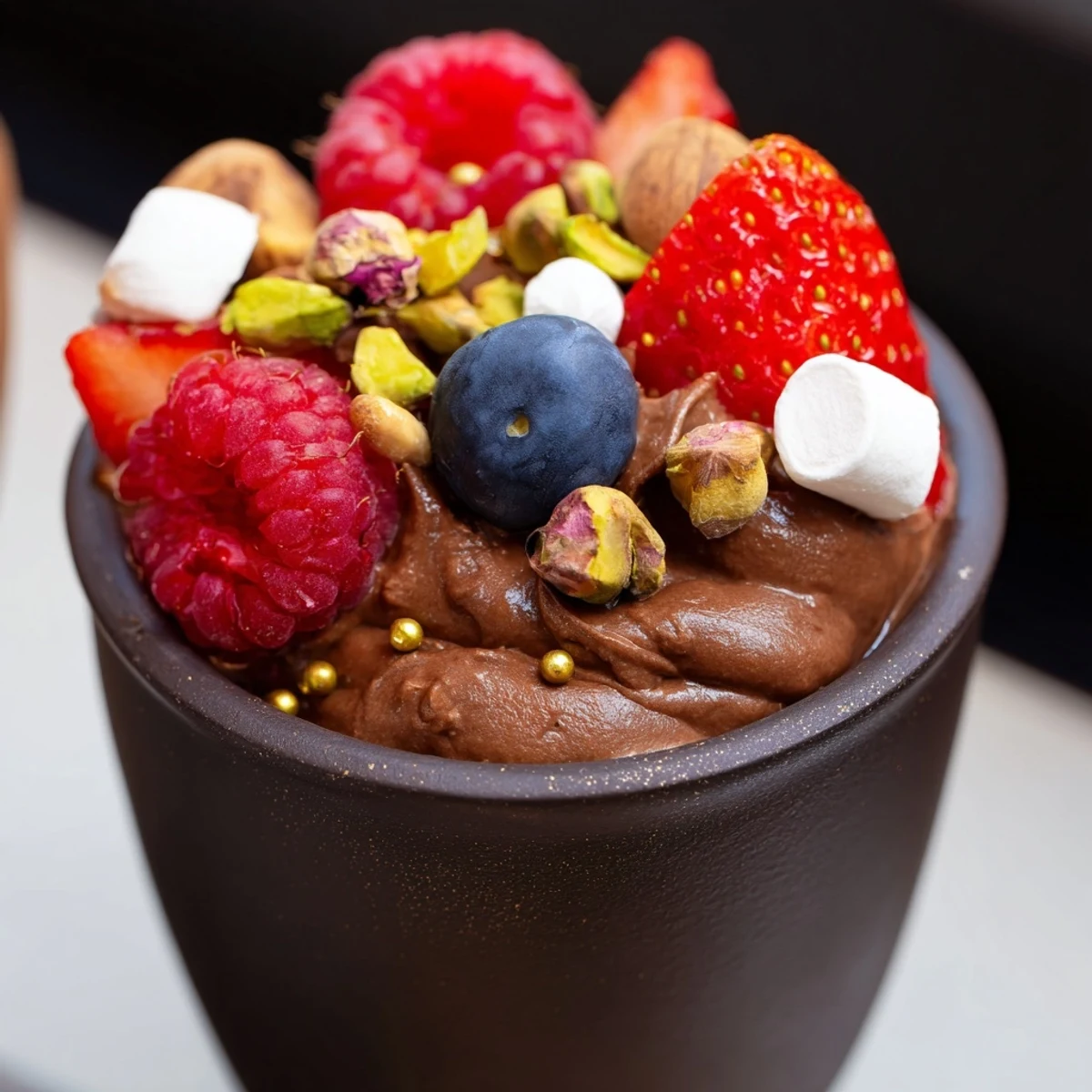 - Pipe or spoon that silky mousse into your chocolate cups, filling them about two-thirds of the way. Now comes the fun part, pile on your berries, nuts, marshmallows, and chocolate curls however feels beautiful to you.
