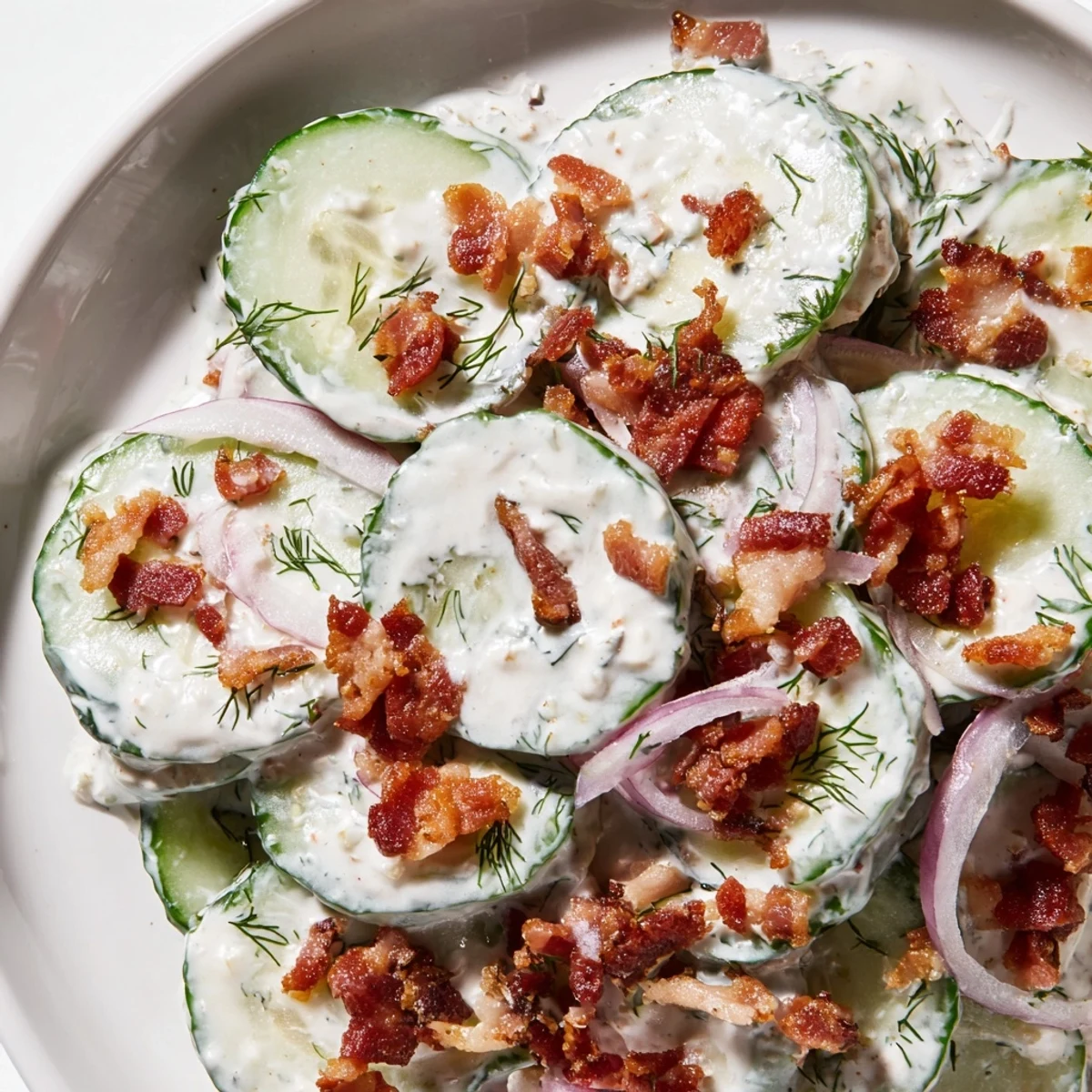 This crisp, refreshing dish combines juicy cucumbers with smoky, crumbled bacon for a perfect balance of flavors. The light tangy dressing brings everything together beautifully.