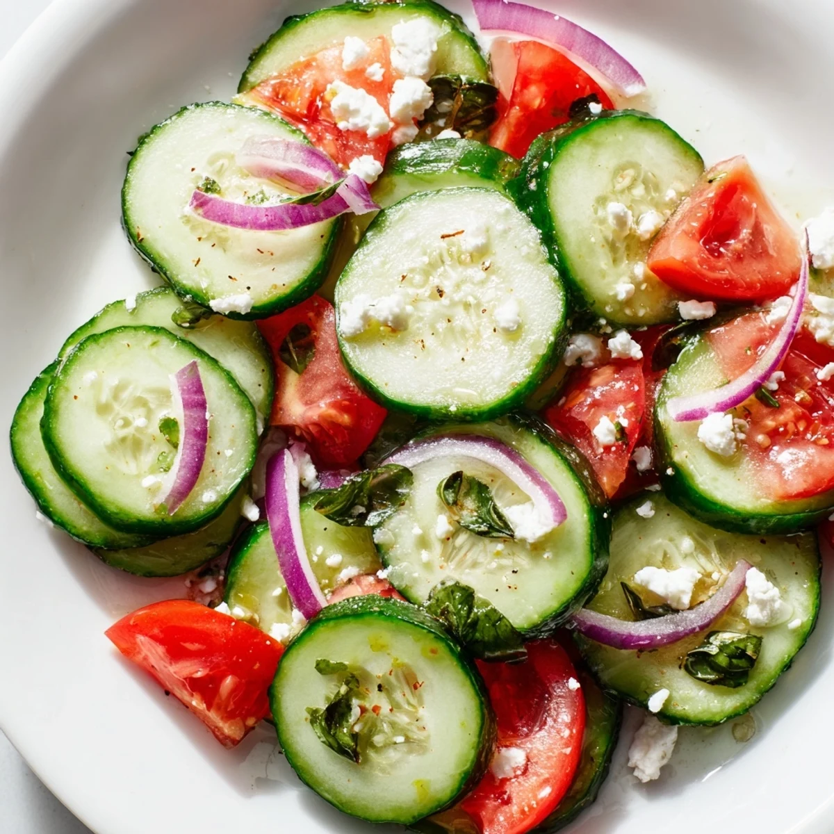 The humidity had been unbearable all week, the kind that makes your skin feel sticky the moment you step outside. My neighbor Maria brought over a bowl of this salad from her garden harvest and suddenly the heat felt manageable. I watched her thin-slice those cucumbers with such practiced ease, like she'd been doing it every summer of her life.