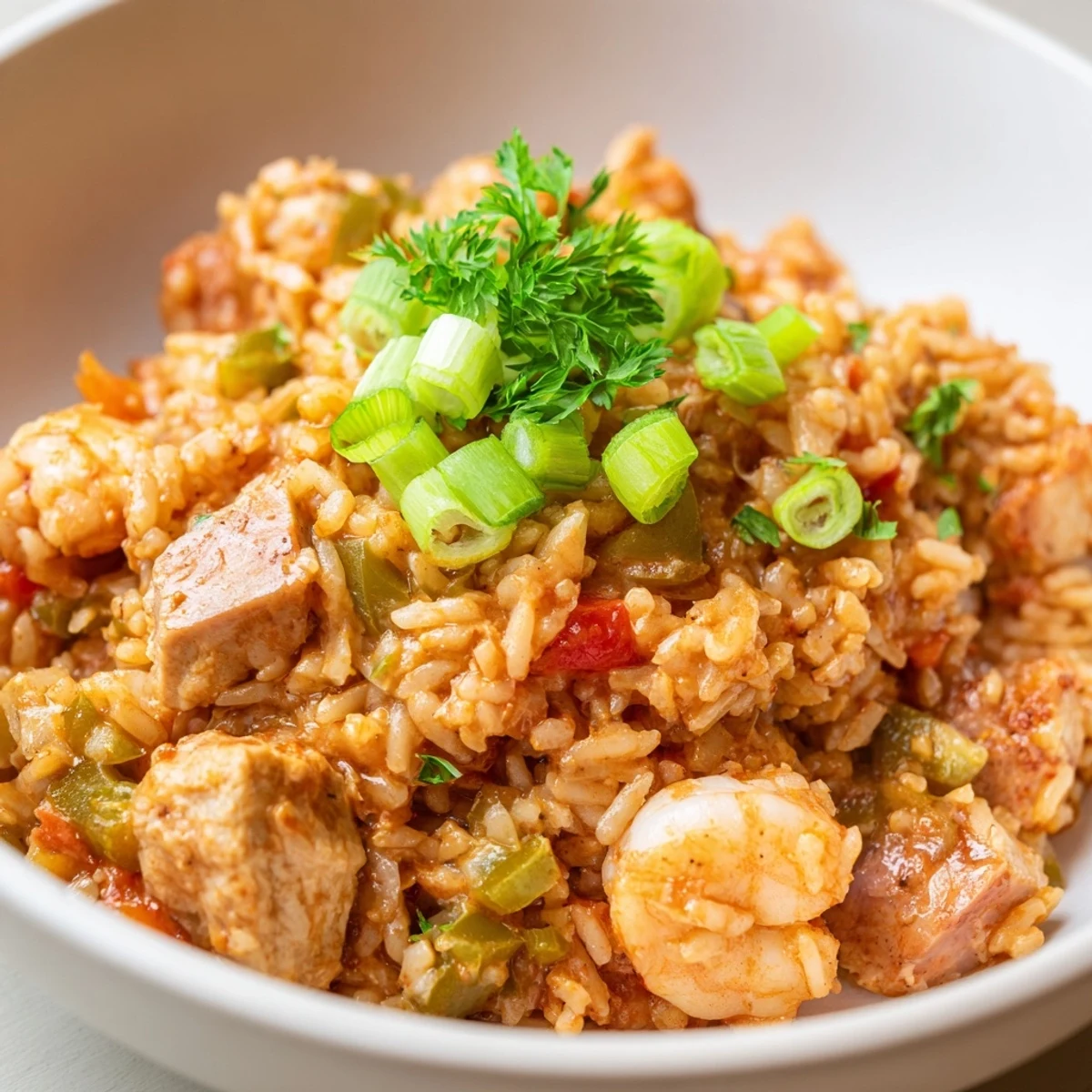 - Fluff the Jambalaya with a fork, then garnish generously with fresh chopped parsley and sliced spring onions. Serve hot, with bright lemon wedges on the side for squeezing.