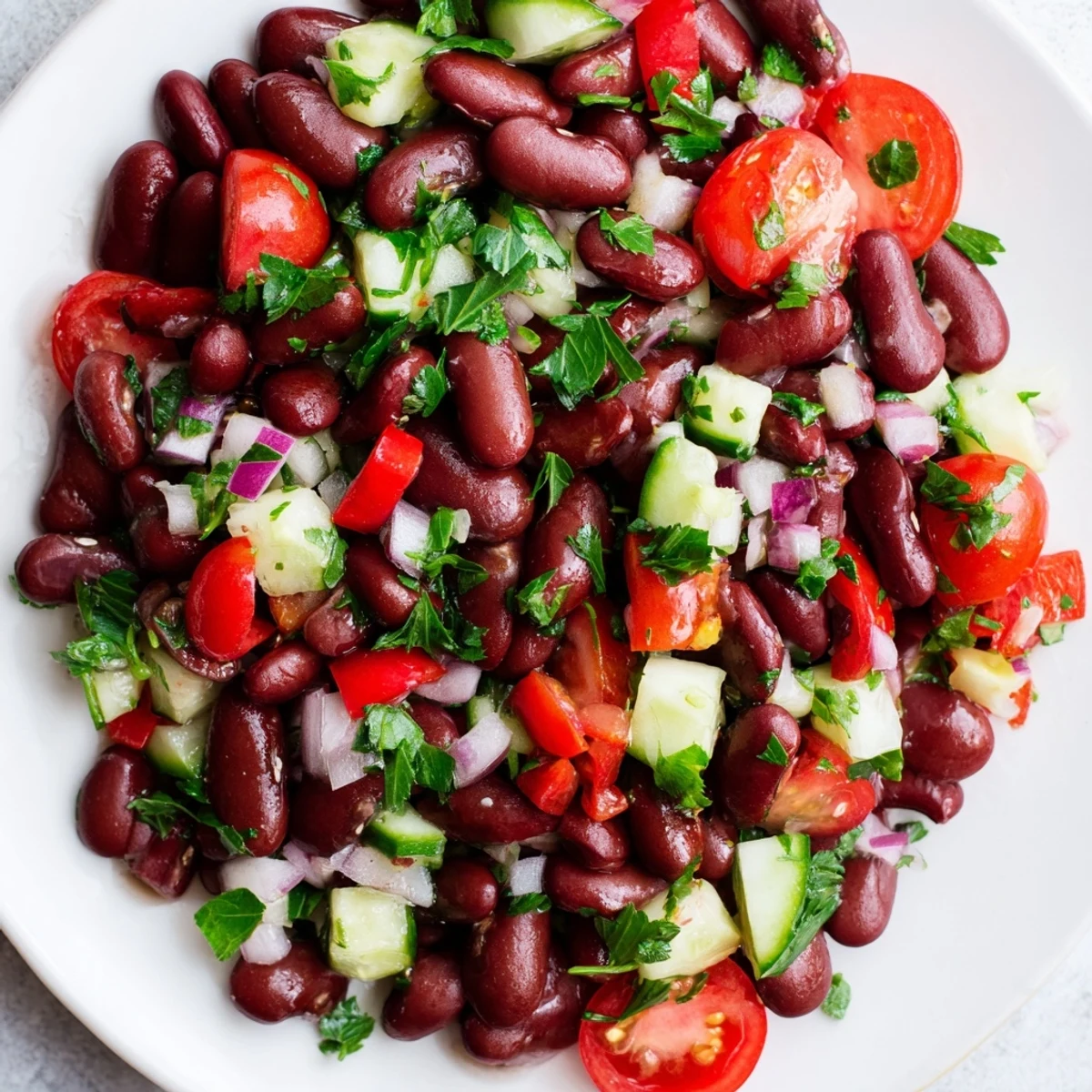 This refreshing kidney bean salad combines protein-rich legumes with crisp red onion, bell pepper, cucumber, and cherry tomatoes. The tangy vinaigrette, made with olive oil, red wine vinegar, and Dijon mustard, ties everything together beautifully. Ready in just 15 minutes with no cooking required.