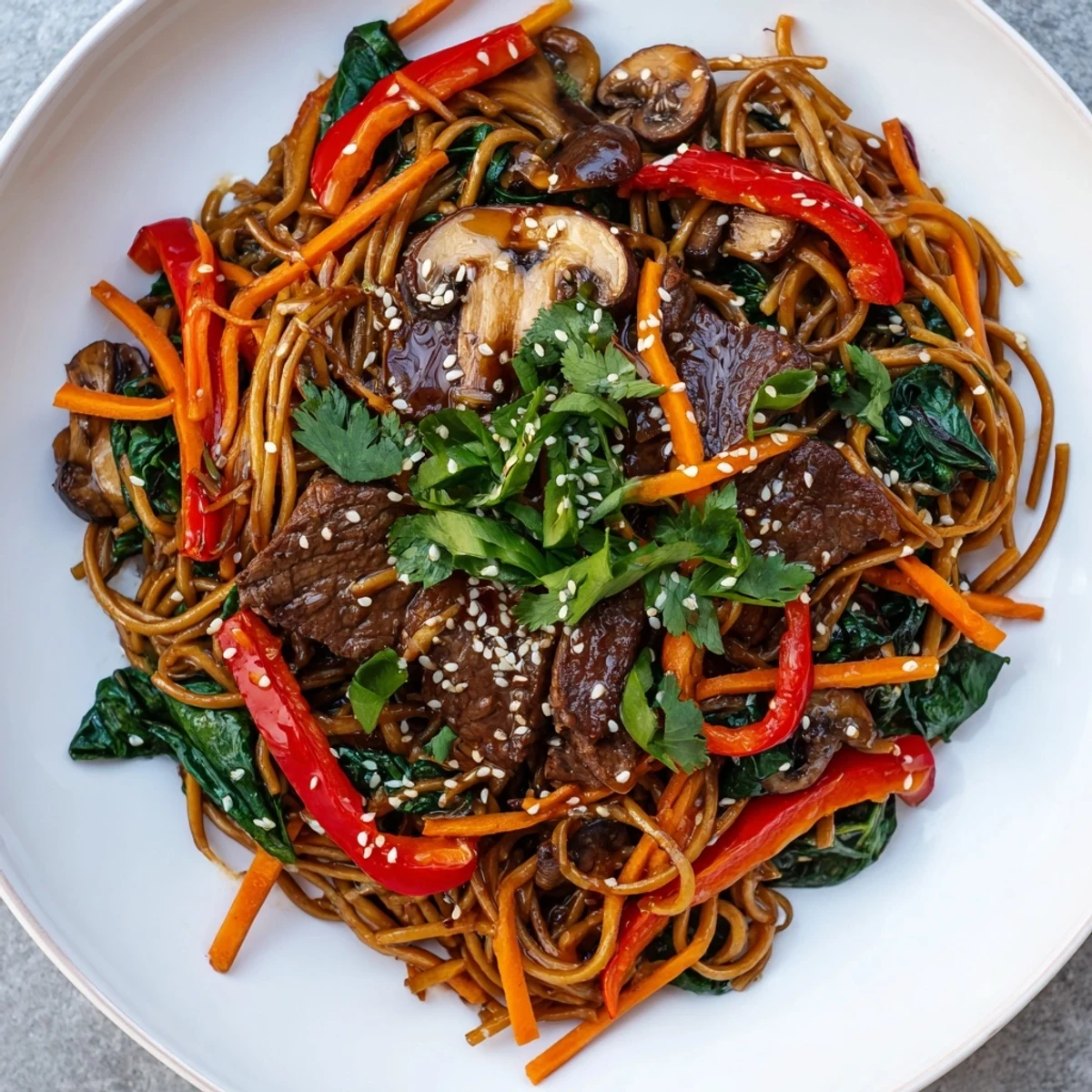 Enjoy tender marinated beef stir-fried with colorful vegetables and chewy sweet potato noodles, all coated in a rich Korean-inspired sauce. The savory-sweet glaze combines gochujang, soy sauce, brown sugar, and sesame oil for authentic depth of flavor.