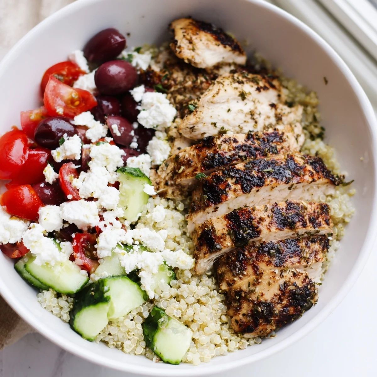 This vibrant Mediterranean bowl combines tender grilled chicken seasoned with aromatic oregano, smoked paprika, and cumin over fluffy quinoa. Crisp cherry tomatoes, refreshing cucumber, tangy red onion, briny Kalamata olives, and creamy feta create layers of texture and flavor. A bright lemon-herb dressing ties everything together. Perfect for meal prep, this gluten-free, high-protein dish comes together in just 45 minutes and serves four generously. Enjoy warm or at room temperature for a satisfying, nutritious meal any day of the week.