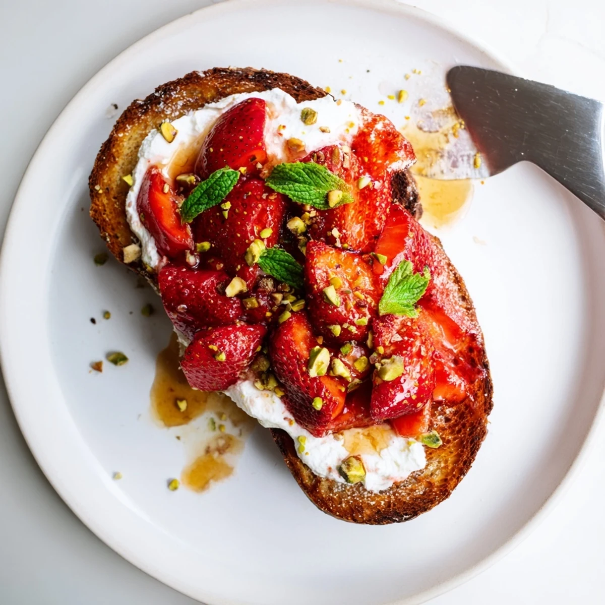 This vibrant dish starts with fresh strawberries roasted until they become soft and syrupy, their natural sweetness enhanced with honey and vanilla. Meanwhile, whole milk ricotta gets whipped with heavy cream and lemon zest until incredibly light and smooth. Spread generously over crispy country bread and topped with those luscious roasted fruit, it creates the perfect balance of creamy, sweet, and savory. Finish with fresh mint, extra honey, or flaky sea salt for an elegant touch.