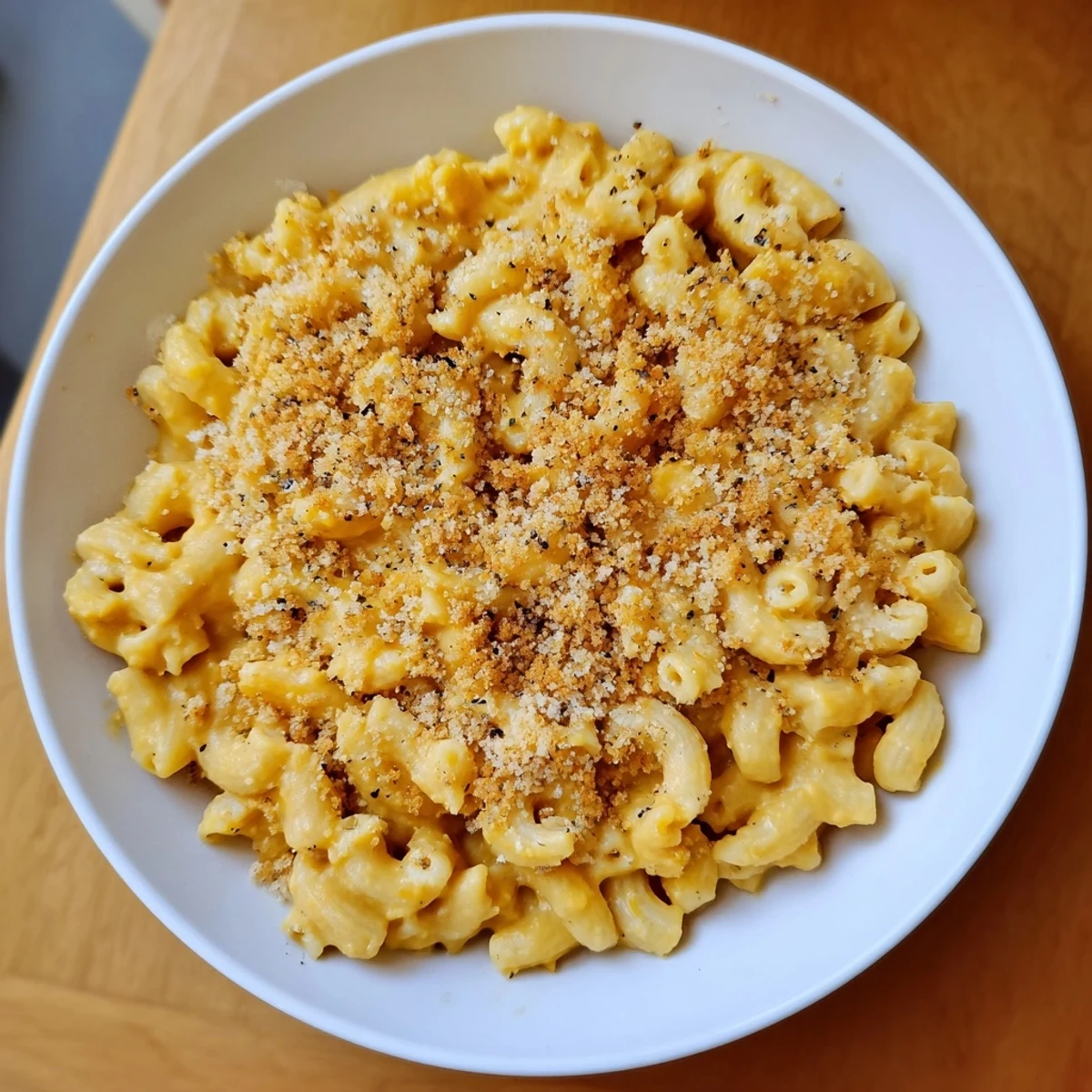 - If you want that crunchy contrast, preheat your broiler, toss panko breadcrumbs with 1 tablespoon olive oil, sprinkle over the mac and cheese in an oven-safe dish, and broil for 2 to 3 minutes until golden brown. Watch it closely so it doesn't burn.